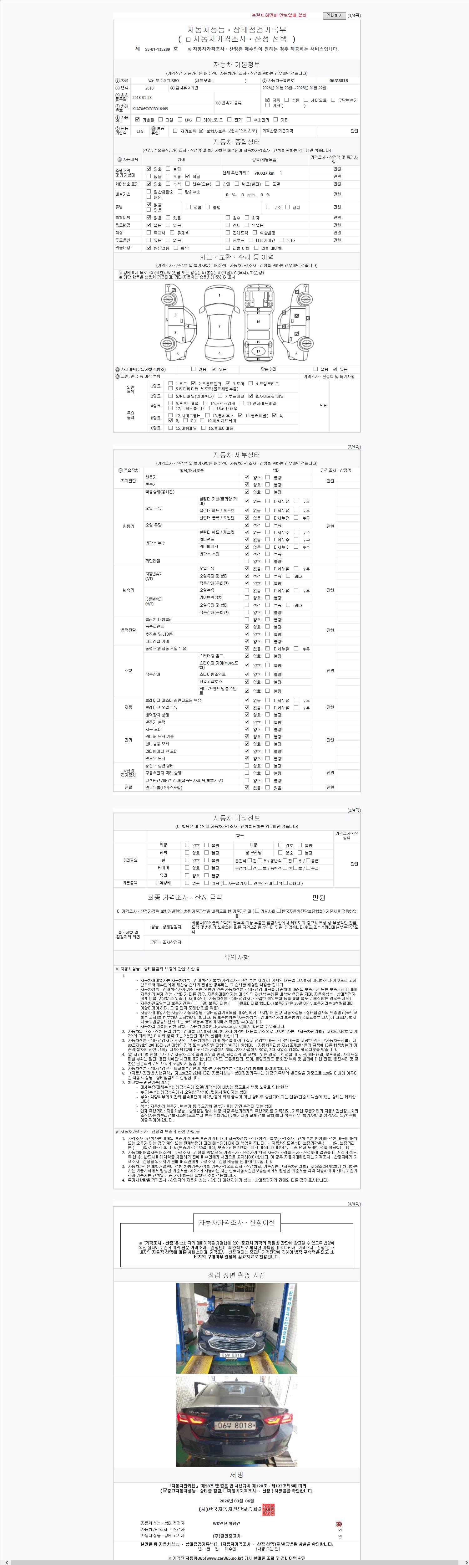 | 주행거리 | 79,027 km | 차량번호 | 06부8018 | 사고유무 | 성능기록부 참조 | 제시번호 | 제 2147483647 호 |