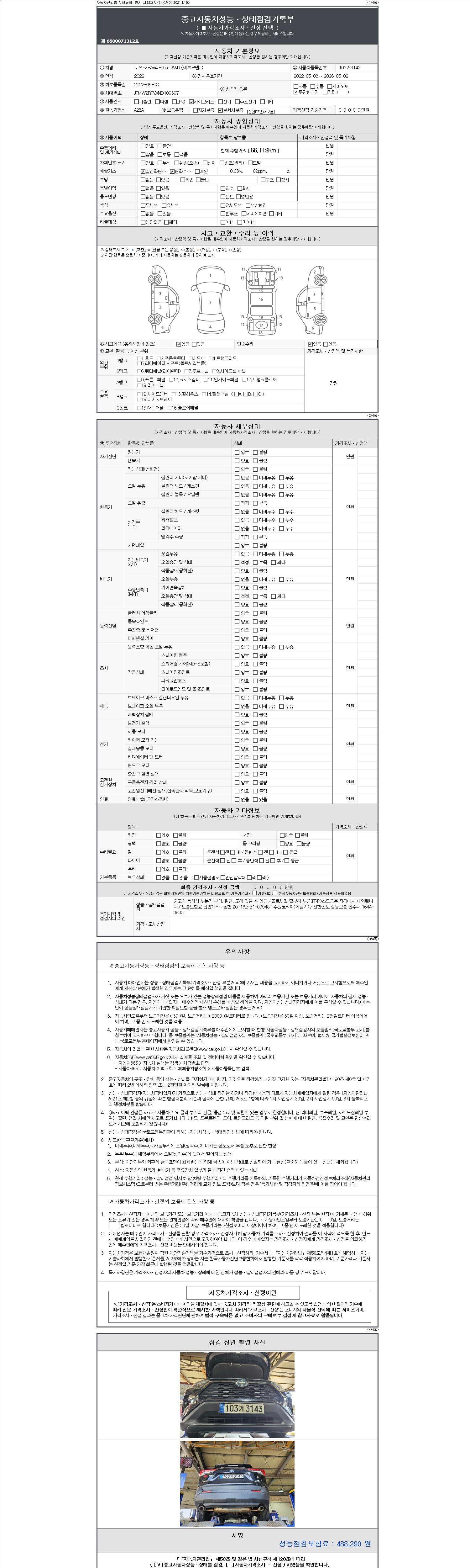 | 주행거리 | 66,119 km | 차량번호 | 103거3143 | 사고유무 | 성능기록부 참조 | 제시번호 | 제 2147483647 호 |