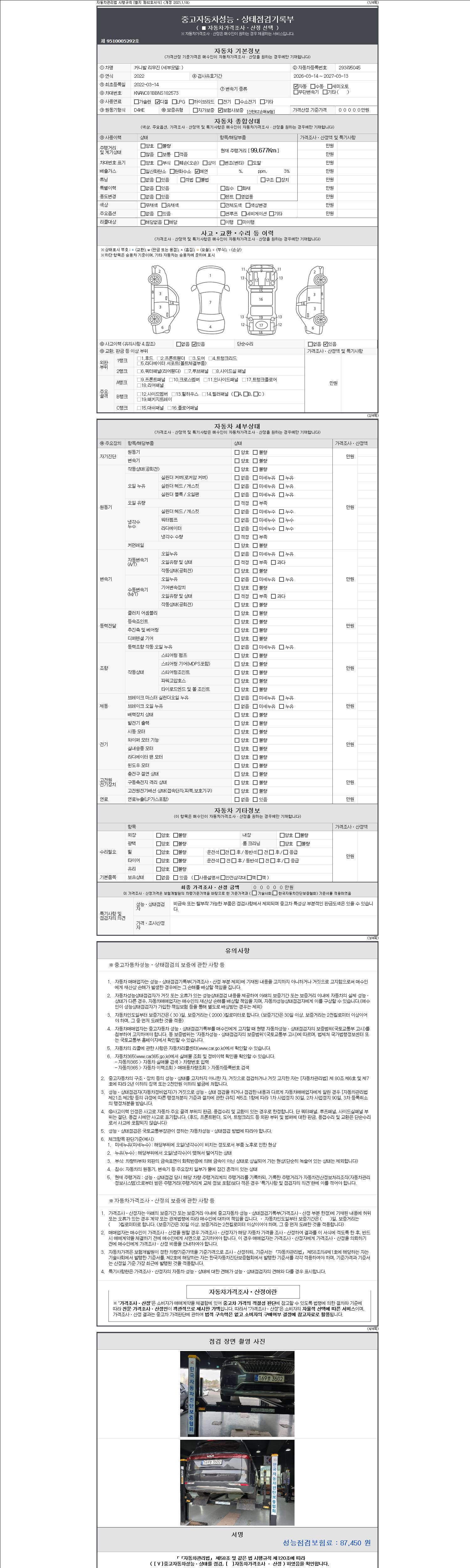 자동차관리법 시행규칙 제120조의 규정에 따라 별지 제 82호서식 《중고자동차 성능, 상태점검 기록부》를 발행한 성능, 상태점검자 및 매매자는 아래의 보증기간 또는 보증거리 이내의 중고자동차, 성능점검 기록부에 기재된 내용과 자동차의 실제 성능, 상태가 다른 경우 계약 또는 관계법령에 따라 매수인에 대하여 책임을 집니다.