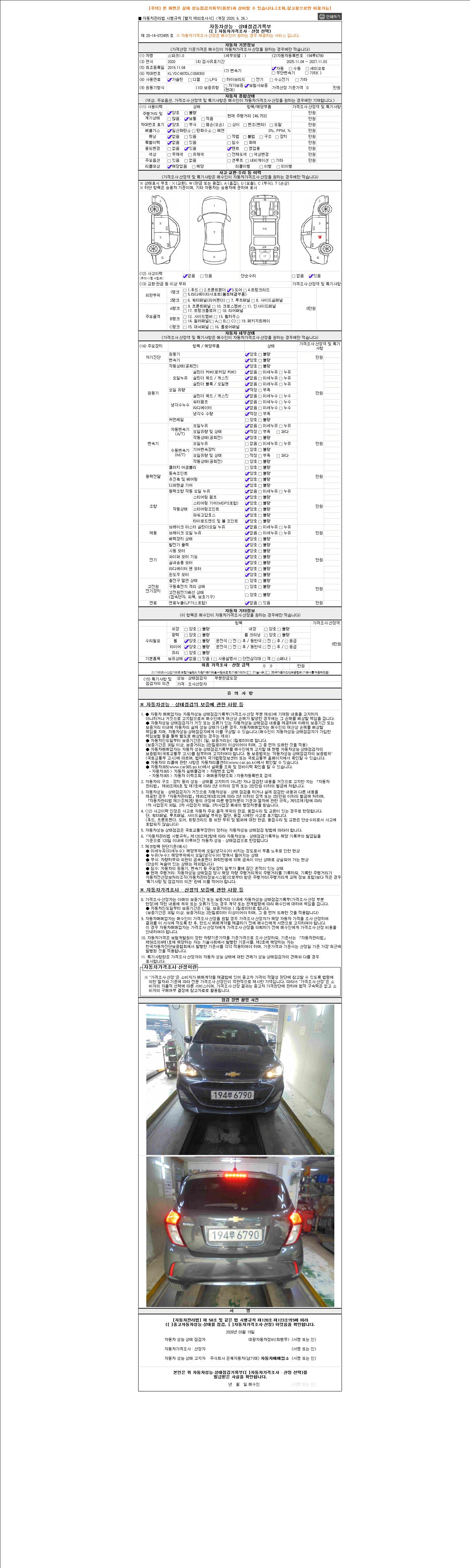 자동차관리법 시행규칙 제120조의 규정에 따라 별지 제 82호서식 《중고자동차 성능, 상태점검 기록부》를 발행한 성능, 상태점검자 및 매매자는 아래의 보증기간 또는 보증거리 이내의 중고자동차, 성능점검 기록부에 기재된 내용과 자동차의 실제 성능, 상태가 다른 경우 계약 또는 관계법령에 따라 매수인에 대하여 책임을 집니다.