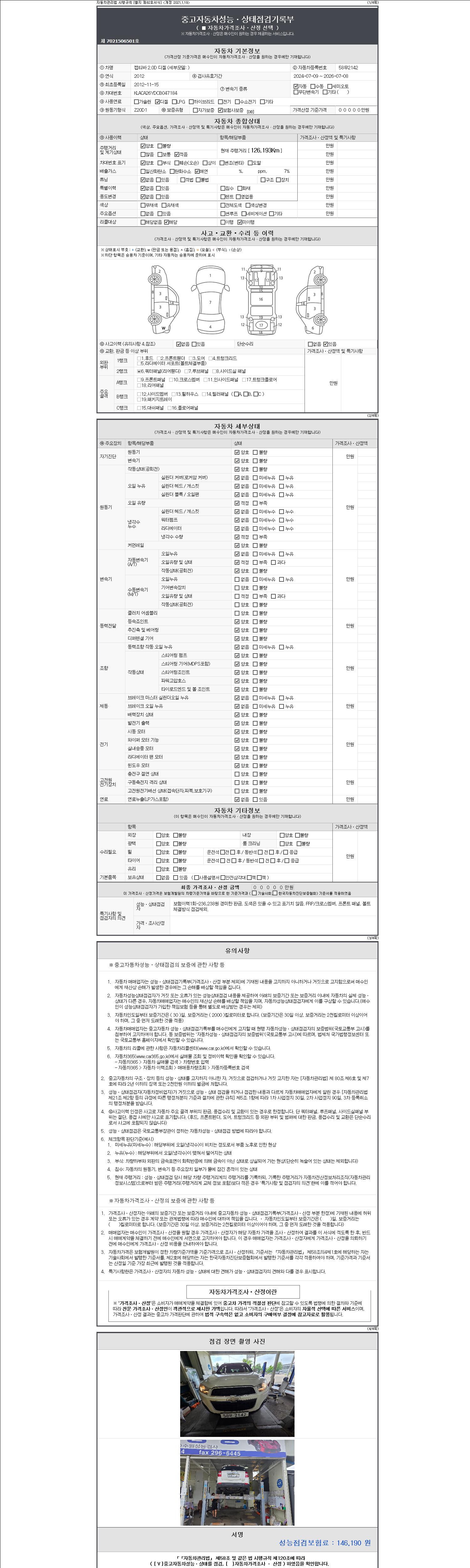| 주행거리 | 126,193 km | 차량번호 | 58무2142 | 사고유무 | 성능기록부 참조 | 제시번호 | 제 2147483647 호 |
