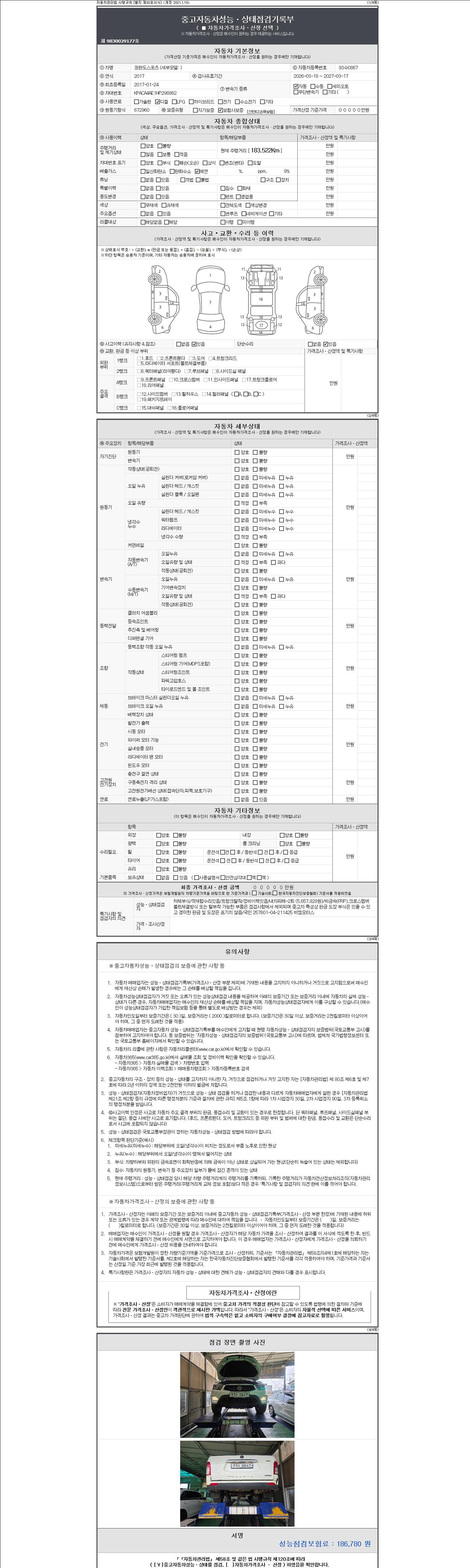 | 주행거리 | 183,522 km | 차량번호 | 93수0867 | 사고유무 | 성능기록부 참조 | 제시번호 | 제 2147483647 호 |
