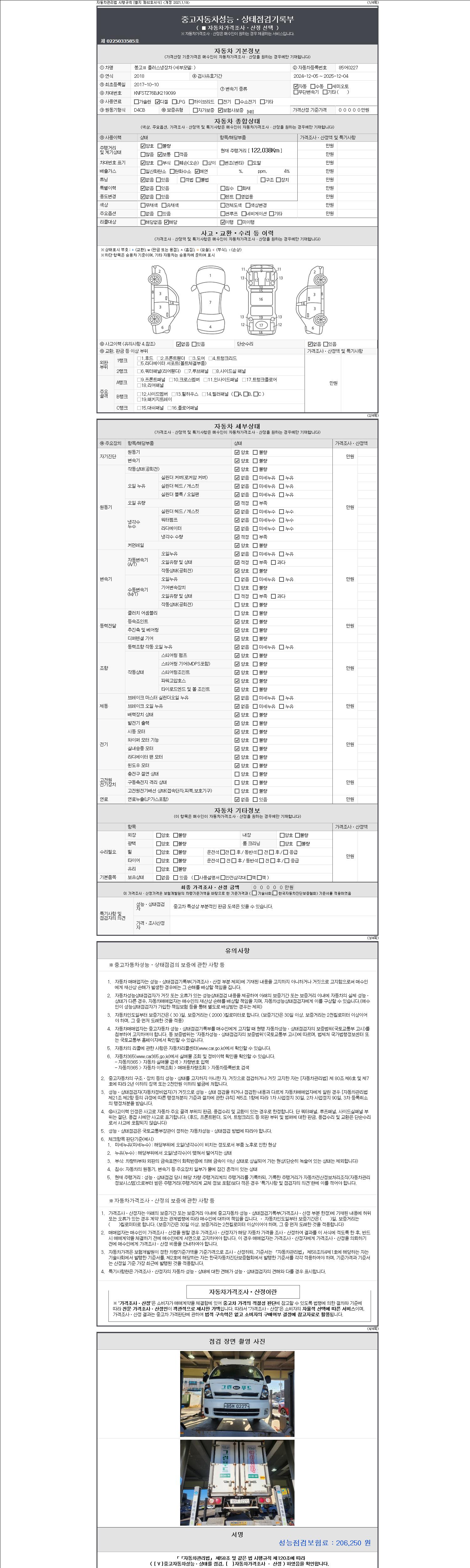| 주행거리 | 122,038 km | 차량번호 | 85어0227 | 사고유무 | 성능기록부 참조 | 제시번호 | 제 2147483647 호 |