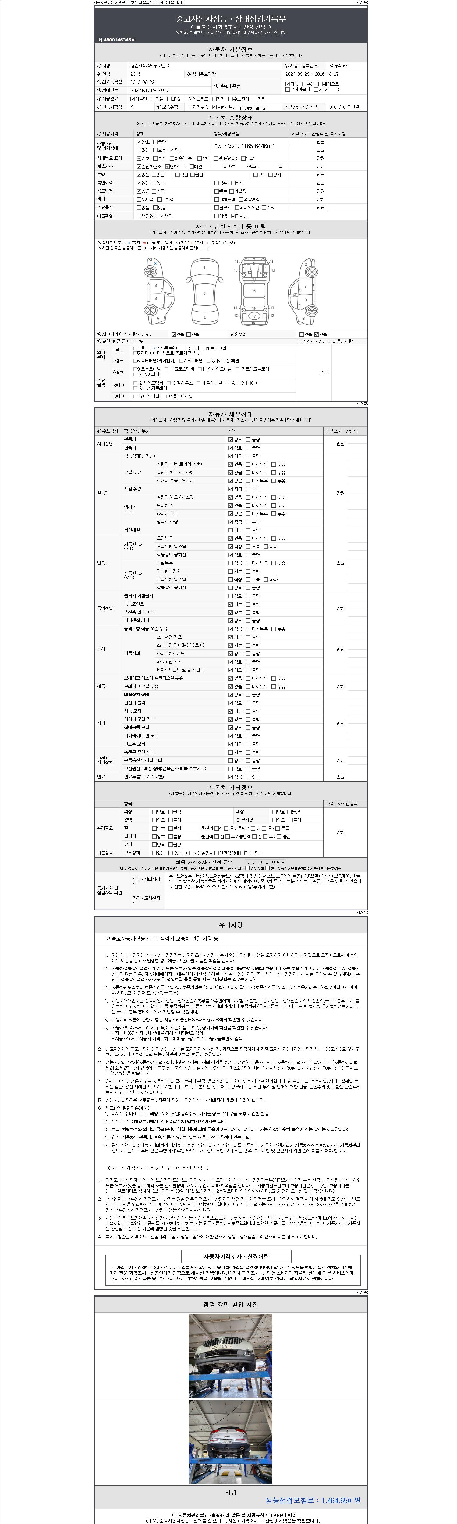 | 주행거리 | 165,644 km | 차량번호 | 62무4565 | 사고유무 | 성능기록부 참조 | 제시번호 | 제 2147483647 호 |