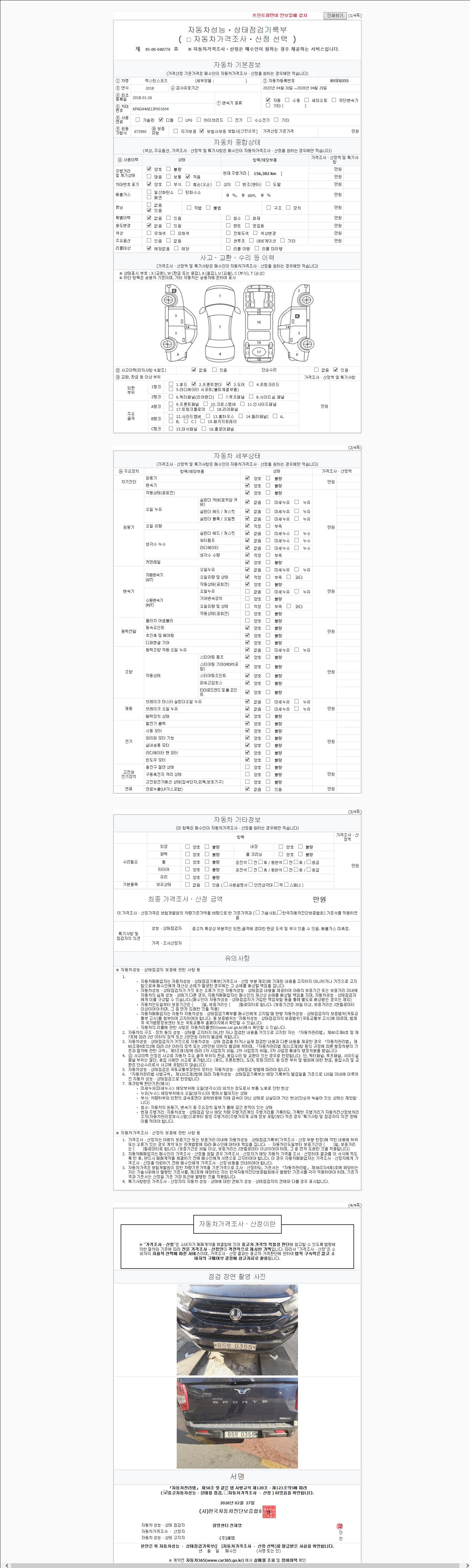 | 주행거리 | 156,380 km | 차량번호 | 85모0355 | 사고유무 | 성능기록부 참조 | 제시번호 | 제 2147483647 호 |