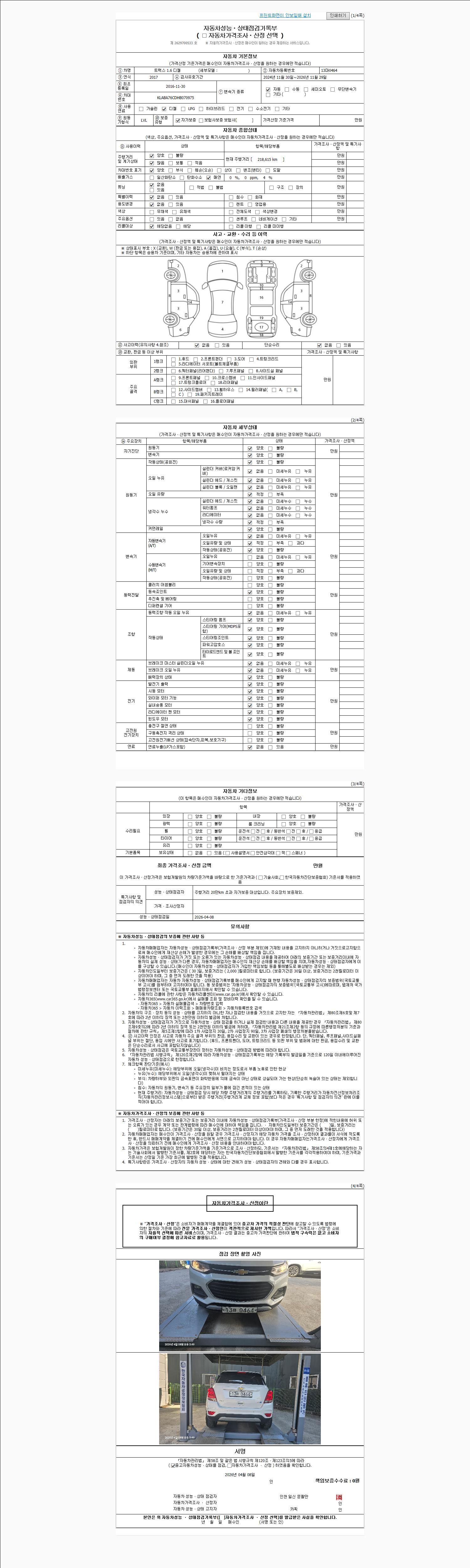 자동차관리법 시행규칙 제120조의 규정에 따라 별지 제 82호서식 《중고자동차 성능, 상태점검 기록부》를 발행한 성능, 상태점검자 및 매매자는 아래의 보증기간 또는 보증거리 이내의 중고자동차, 성능점검 기록부에 기재된 내용과 자동차의 실제 성능, 상태가 다른 경우 계약 또는 관계법령에 따라 매수인에 대하여 책임을 집니다.